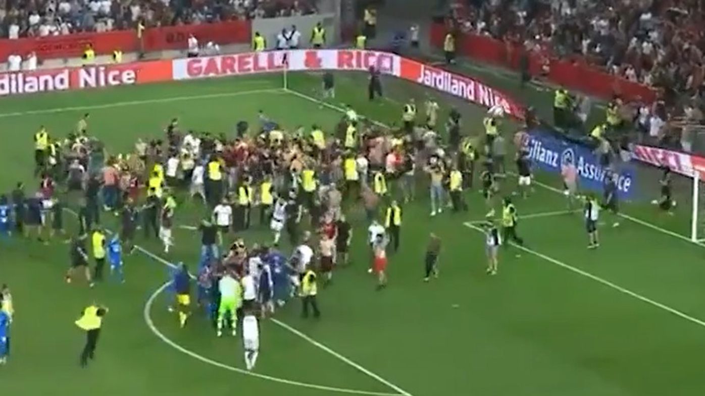 Chaos erupted at a ligue 1 soccer game in france between nice and marseille after fans jumped over the barrier and engaged in a scary brawl with players and stadium security.